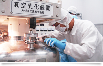 特許技術「シルクフィブロイン乳化法」は独立行政法人との共同研究により開発された乳化方法で、今まで化粧品の乳化には欠かせなかった界面活性剤を一切使用しないで乳化させることを可能にしました。